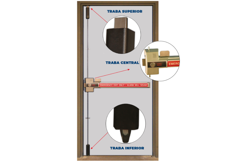La barra antipánico o tridente es un mecanismo que garantiza la fácil apertura de una puerta accionando la barra horizontal. Este herraje debe de estar instalado en la cara interior de la puerta y mantiene la posición de puerta cerrada.